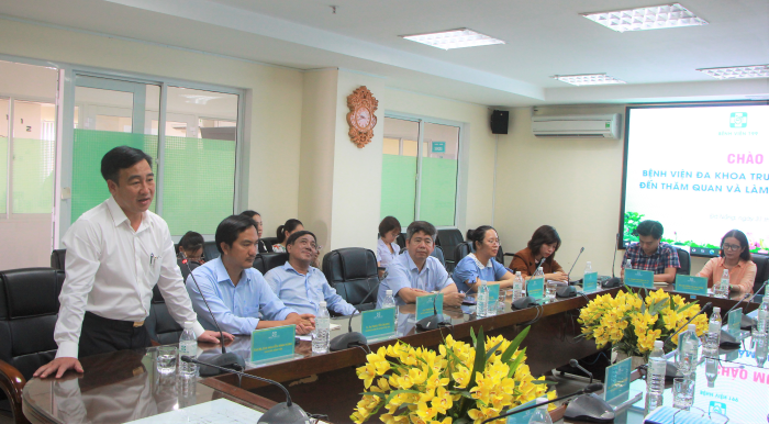 TS.BS Quách Hữu Trung chia sẻ với đoàn công tác về tình hình hoạt động của Bệnh viện 199