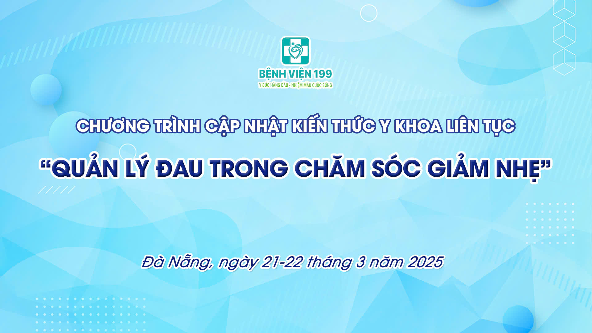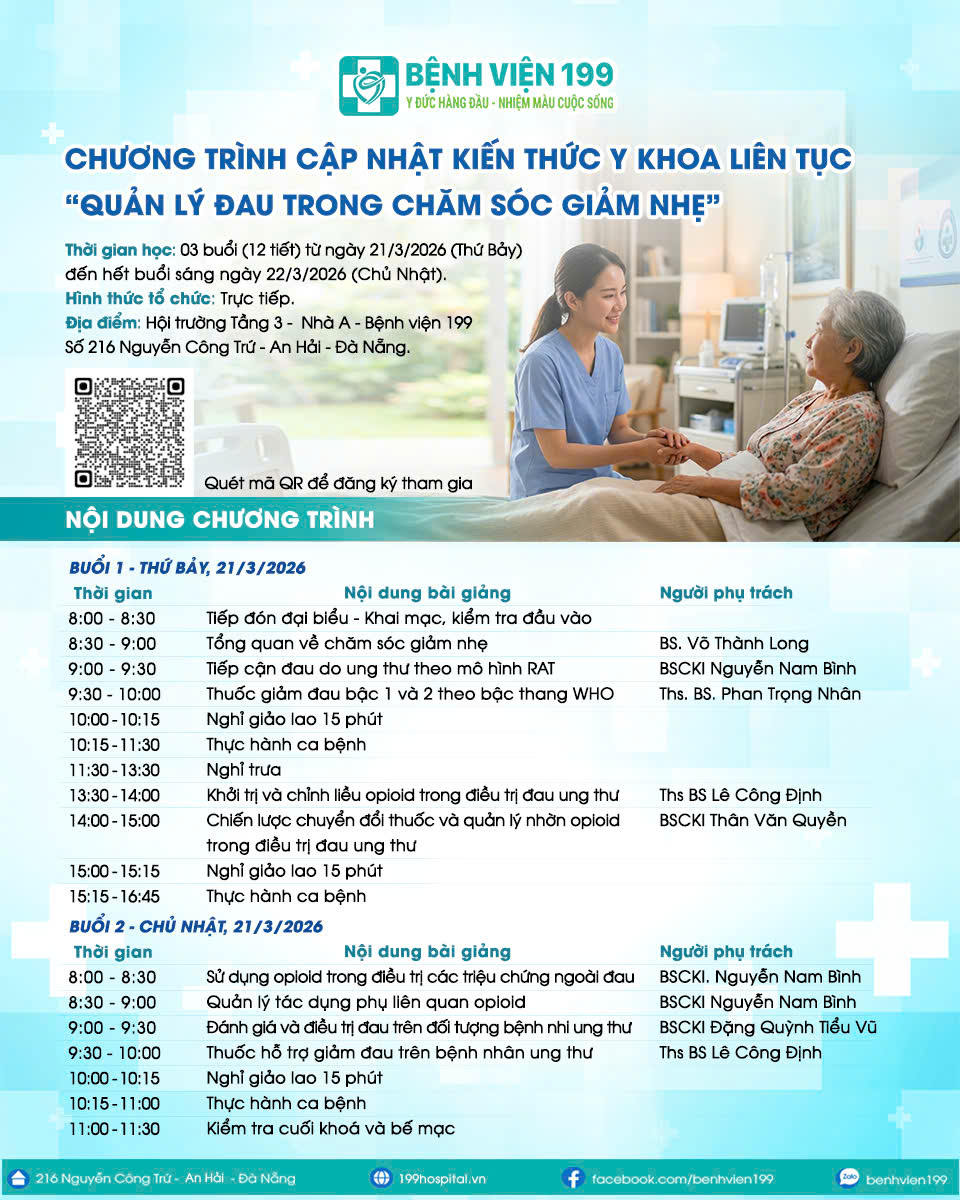 Bệnh viện 199 trân trọng thông báo tổ chức chương trình cập nhật kiến thức y khoa liên tục “Quản lý đau trong chăm sóc giảm nhẹ”, dự kiến diễn ra từ ngày 21/3/2026 đến hết buổi sáng ngày 22/3/2026.