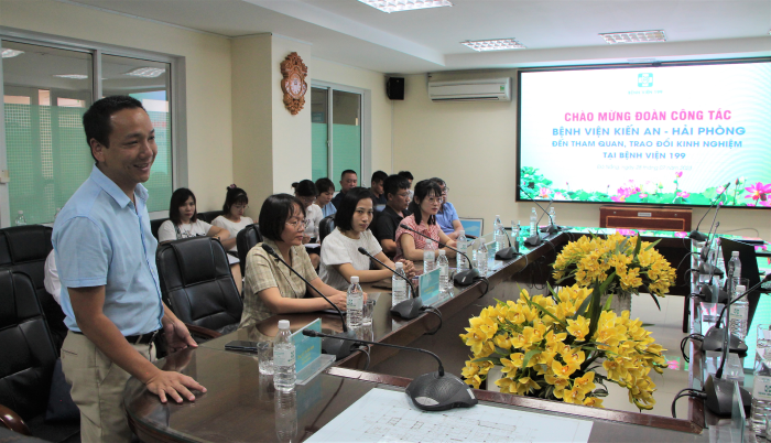 Giám đốc Bệnh viện Quách Hữu Trung chia sẻ: Bệnh viện 199 vui mừng chào đón đoàn công tác Bệnh viện Kiến An tới thăm, học tập, trao đổi kinh nghiệm. Qua đó, Giám đốc điểm qua về một số thế mạnh mà Bệnh viện mà đoàn công tác quan tâm như Chuyển đổi số, Trung tâm Bác sĩ Gia đình, Điều trị đau, Bệnh án điện tử…Đồng thời mong muốn thời gian tới hai đơn vị sẽ trao đổi, hợp tác toàn diện trong các lĩnh vực mà hai bên quan tâm.