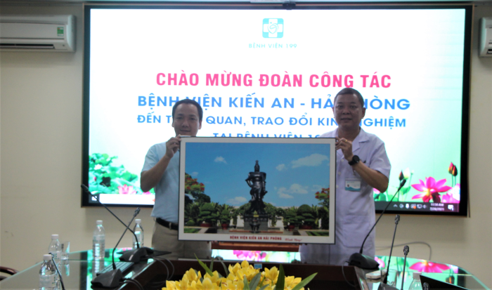 Cuối buổi làm việc, Phó Giám đốc Bệnh viện Kiến An Vũ Tuấn Anh đã trao tặng quà lưu niệm cho Bệnh viện 199 và đi thăm một số Khoa/Phòng liên quan của Bệnh viện 199.
