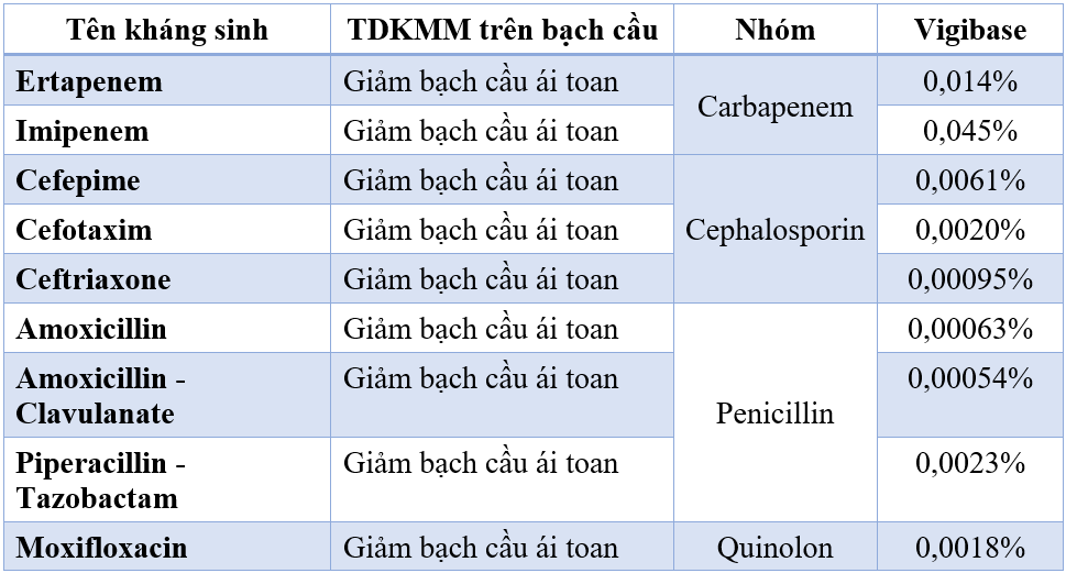 Bảng 1. Tần suất giảm bạch cầu ái toan do kháng sinh ghi nhận trên Vigibase