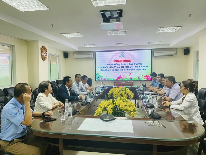 Ngày 11/5/2023, Bệnh viện 199 tiếp đoàn công tác Cục Phát triển thị trường và doanh nghiệp KHCN (Bộ KHCN) do TS Phạm Hồng Quất dẫn đầu thăm và làm việc với Bệnh viện 199. Hai bên trao đổi thông tin về tình hình phát triển khoa học công nghệ ứng dụng thực tiễn trong công tác khám chữa bệnh, đặc biệt là thảo luận chuyên sâu về mô hình đổi mới sáng tạo, chuyển đổi số trong lĩnh vực y tế chăm sóc sức khoẻ.