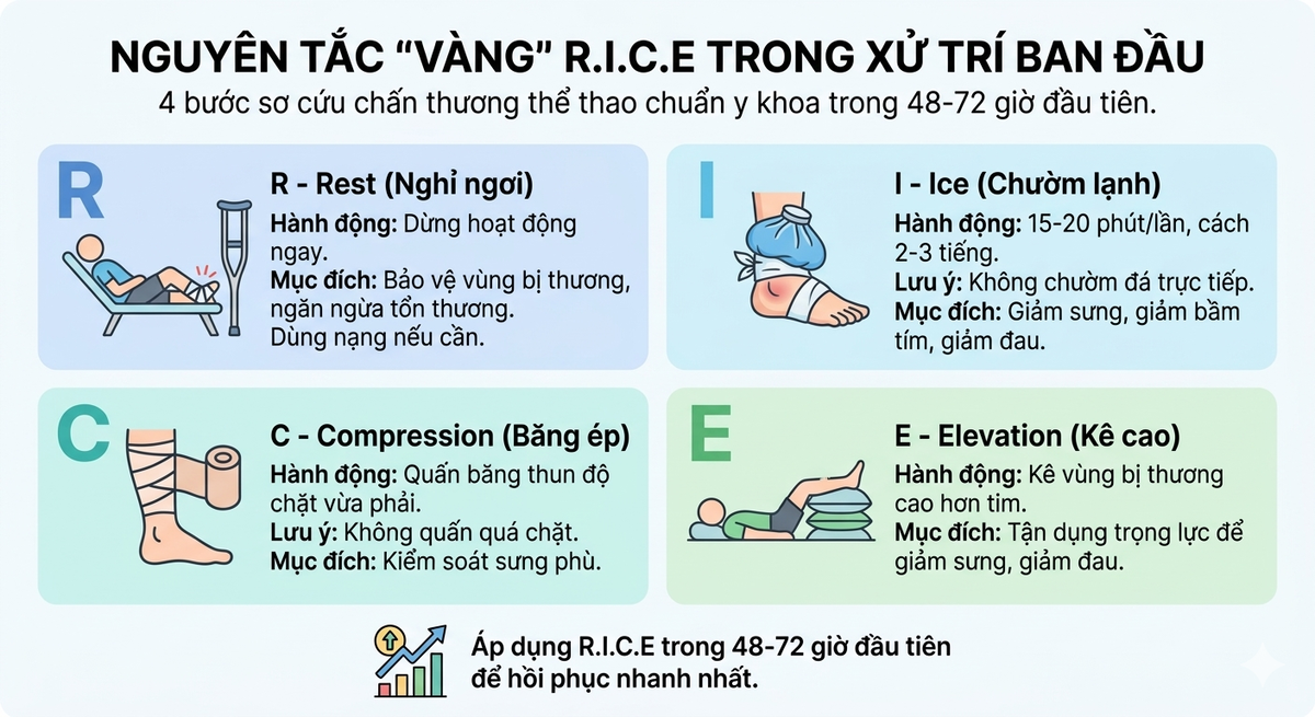 Khi xảy ra chấn thương phần mềm (giãn cơ, bong gân, dập phần mềm), việc áp dụng quy trình R.I.C.E trong 48 - 72 giờ đầu tiên là yếu tố quyết định tốc độ hồi phục và giảm thiểu rủi ro biến chứng mạn tính.