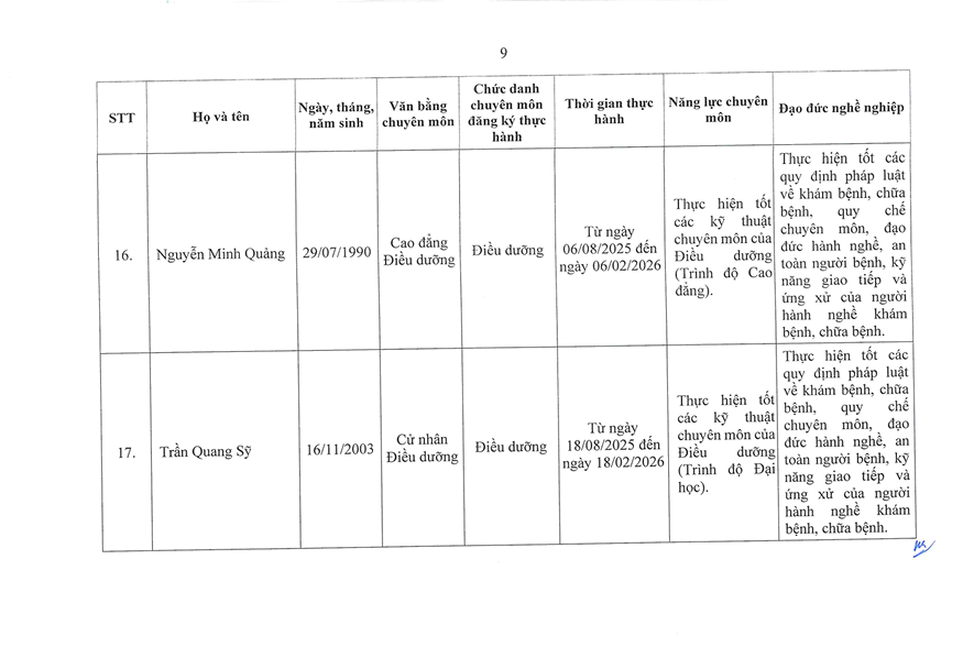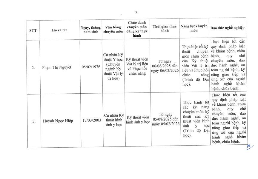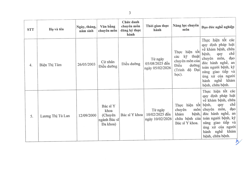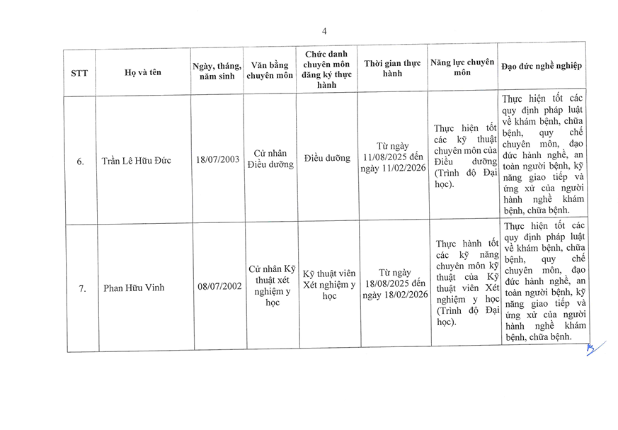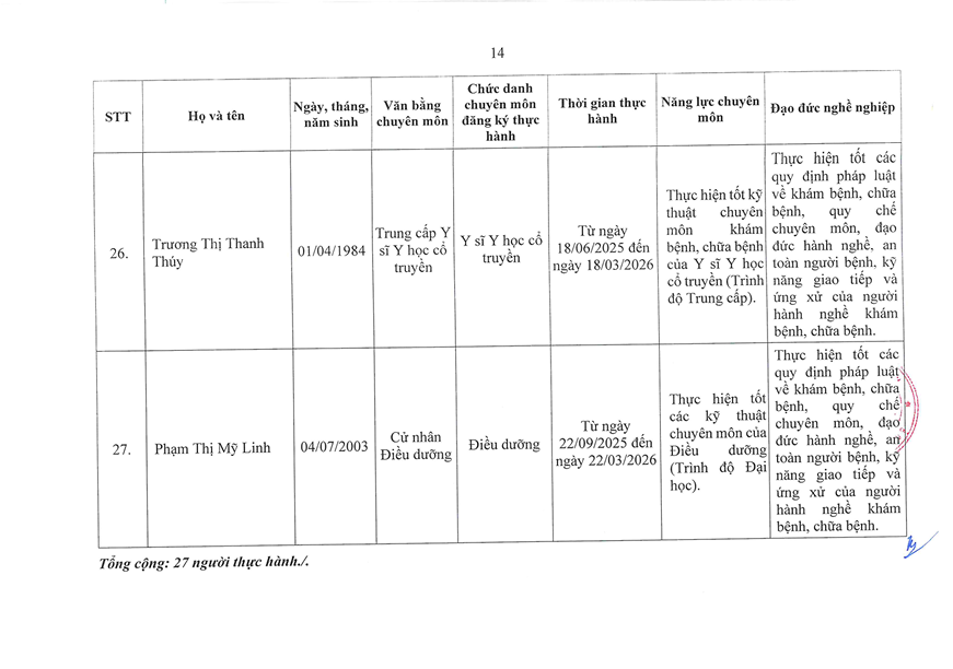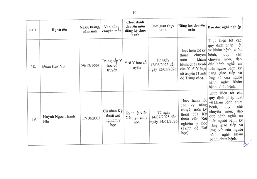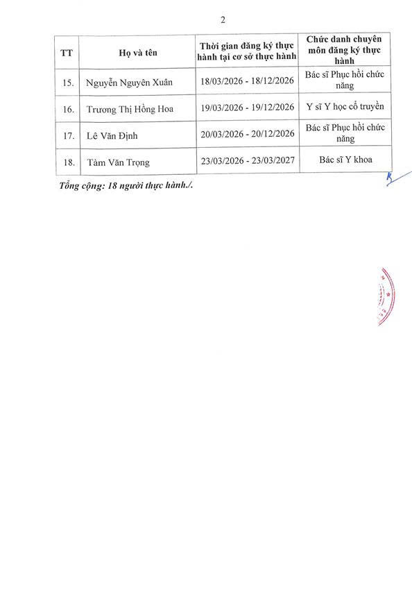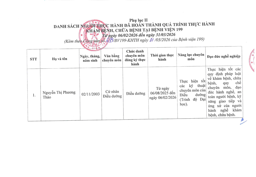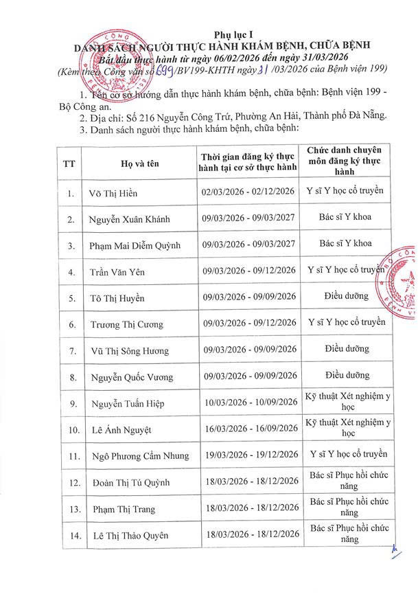 TUYỂN SINH - ĐÀO TẠO DANH SÁCH NGƯỜI THỰC HÀNH CHUYÊN MÔN KHÁM BỆNH CHỮA BỆNH TẠI BỆNH VIỆN 199 ✍️ Nguyễn Ngô Diễm Quỳnh 📅 29/03/2026 👁️ 1 lượt xemChia sẻ: Facebook Zalo Sao chép linkBài viết liên quan THÔNG BÁO TUYỂN SINH KHÓA ĐÀO TẠO KỸ THUẬT CHUYÊN MÔN KHÁM BỆNH, CHỮA BỆNH "XOA BÓP, BẤM HUYỆT" 12/02/2026Chiêu sinh khóa đào tạo “Ngôn ngữ trị liệu dành cho trẻ tự kỷ” khóa 26 tại Bệnh viện 199 08/10/2025Tuyển sinh khoá đào tạo kỹ thuật “Điện tâm đồ” Khóa 3 năm 2025 08/10/2025