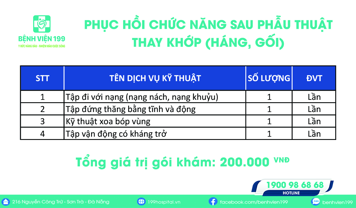 Phục hồi sau thay khớp gối, khớp háng giúp bạn lấy lại khả năng vận động. Bệnh viện 199 Đà Nẵng mang đến phác đồ cá nhân hóa, chi phí hợp lý, hiệu quả tối ưu.