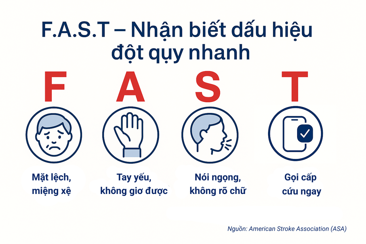 - T – Time (Thời gian): Nếu có bất kỳ dấu hiệu nào, hãy gọi cấp cứu ngay. "Giờ vàng" (3 - 4.5 giờ đầu) là cơ hội duy nhất để tái thông mạch máu và giảm thiểu di chứng.