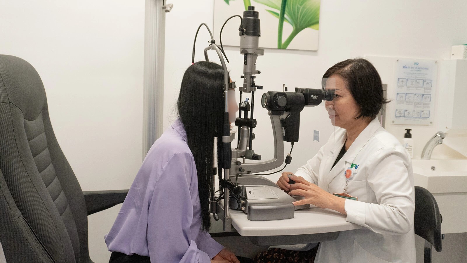 Bác sĩ Mai khám mắt cho chị V. Serley sau phẫu thuật lão thị.